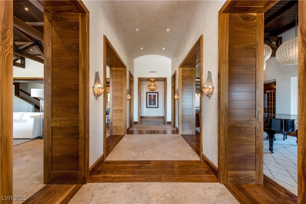 Spectacular home perched high above the city with stunning 360-degree views of The Strip, Vegas Valley & surrounding mountains from every window. This nearly 15,000 sq ft home recently underwent an exquisite $6 million renovation of the finest standard and is in one of the most prestigious neighborhoods in Vegas: triple gated The Pointe enclave of The Ridges. Enjoy the utmost privacy, backing to the mountains & no surrounding neighbors. Whether you're a true home cook or prefer a private chef, the kitchen has it all: double islands w/waterfall onyx, 3 full ovens, commercial walk-in fridge/freezer, steamer, deep fat fryer & more. Seamless indoor/outdoor living at its best with multiple pocketing door systems, huge balcony w/dining & full outdoor kitchen. Gorgeous primary suite w/more views, two enormous closets, lounge, sauna, yoga studio, steam shower, soaking tub & private outdoor bath. Other features: state-of-the-art movie theater, game room, loft area, neg-edge pool & much more.