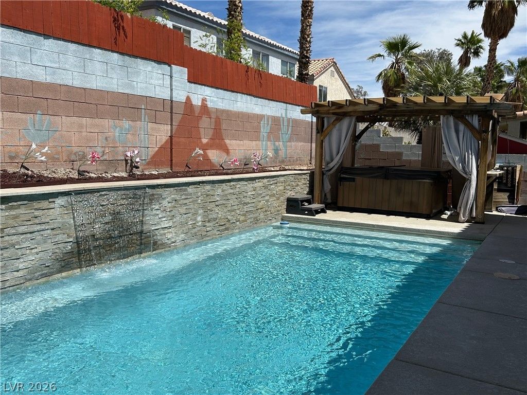 Beautifully home in a desirable Southwest Las Vegas neighborhood! This home features an open floor plan with spacious living areas, a functional kitchen with ample cabinetry, and plenty of natural light throughout. The primary suite offers a comfortable retreat with an ensuite bath, while secondary bedrooms provide flexibility for guests or a home office. Enjoy a private backyard with pool and above ground spa perfect for relaxing or entertaining. Conveniently located near shopping, dining, parks, and freeway access.